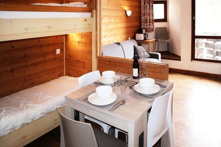 In the vibrant heart of the Orres 1650 resort, this charming studio apartment invites you to experience the magic of the French Alps in every season. With its prime location directly on the slopes, you can step out of your door and into a world of snowy adventures or sunlit alpine trails. The south-facing balcony offers a breathtaking view of the pistes, perfect for savoring your morning coffee or unwinding after an active day in the mountains. Whether you're here for skiing, hiking, or simply soaking in the serene atmosphere, this residence promises a memorable escape. \n\nThoughtfully designed to accommodate up to four guests, the studio features a cozy alcove with two single bunk beds and a living area with a comfortable double sofa bed. The kitchenette is equipped for preparing hearty meals, while the bathroom provides all the essentials for your stay. Linoleum flooring throughout adds a touch of practicality and warmth, ensuring a welcoming ambiance. A ski locker on the ground floor makes it easy to store your gear and head out for your next adventure. \n\nThe location is unbeatable, with direct access to the slopes and all the amenities of the resort just steps away. From ski schools and rental shops to charming restaurants and après-ski spots, everything you need is within easy reach. In the summer months, the area transforms into a haven for outdoor enthusiasts, offering hiking trails, mountain biking routes, and panoramic views that will leave you in awe. \n\nWhether you're seeking thrilling winter sports or tranquil summer escapes, this studio apartment at Orres 1650 is your gateway to the best of the Alps. Create unforgettable memories in a setting that combines comfort, convenience, and stunning natural beauty.
