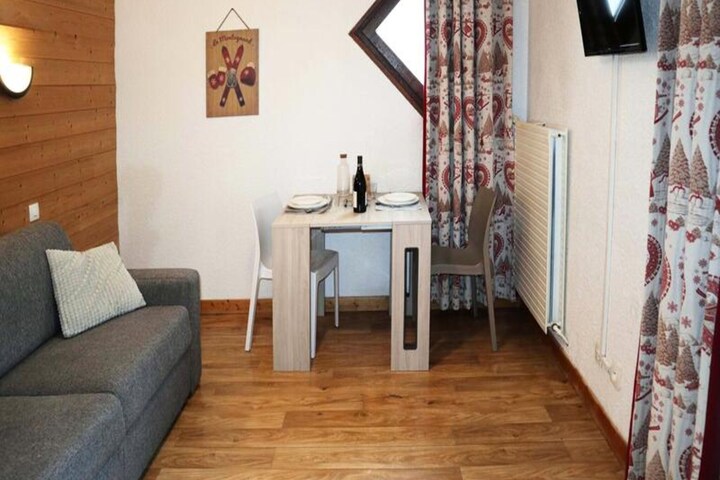 High above the sparkling valley, where the crisp mountain air invigorates the senses, this charming studio apartment invites you to experience the serene beauty of the Orres 1650 resort. Once a bustling hotel, the building has been thoughtfully transformed into a modern residence that blends alpine charm with contemporary comfort. With its prime location on the snow front, you’re just steps away from the slopes, making it a perfect retreat for ski enthusiasts or those seeking a tranquil mountain escape. From your east-facing balcony, soak in breathtaking views of the valley as the morning sun casts its golden glow over the landscape. \n\nDesigned for two guests, the studio features a cozy living room with a double sofa bed, a compact yet functional kitchenette, and a sleek shower room with WC. The linoleum flooring adds a clean and practical touch, while the layout ensures every corner is utilized for maximum comfort. A dedicated ski locker on the ground floor makes storing equipment effortless, allowing you more time to enjoy the pristine slopes. The residence is equipped with heating, ensuring a warm and inviting atmosphere after a day of adventure. \n\nBeyond the slopes, Orres 1650 offers a vibrant mix of activities and amenities. Explore charming local shops, indulge in hearty alpine cuisine at nearby restaurants, or simply wander through the picturesque village. In summer, the area transforms into a haven for hikers and cyclists, with trails that wind through lush forests and open up to panoramic views of the valley. Whether you’re here to ski, relax, or explore, this studio provides the perfect base for unforgettable mountain memories. \n\nLet the beauty of the French Alps inspire your next getaway—this cozy retreat is waiting to welcome you.