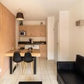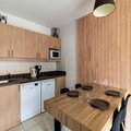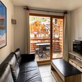 The apartment features a fully equipped kitchen with all necessary appliances, including a stove, microwave, and refrigerator, providing everything needed for a self-catered stay. A dining area is included, offering ample space for meals and gatherings. The bathroom comes with a bathtub for added comfort, and the residence includes a heated indoor swimming pool (seasonal), ideal for relaxing after a day of outdoor activities. The apartment is accessible via an elevator and offers ample storage space at the entrance for added convenience.