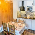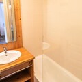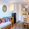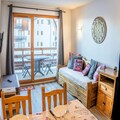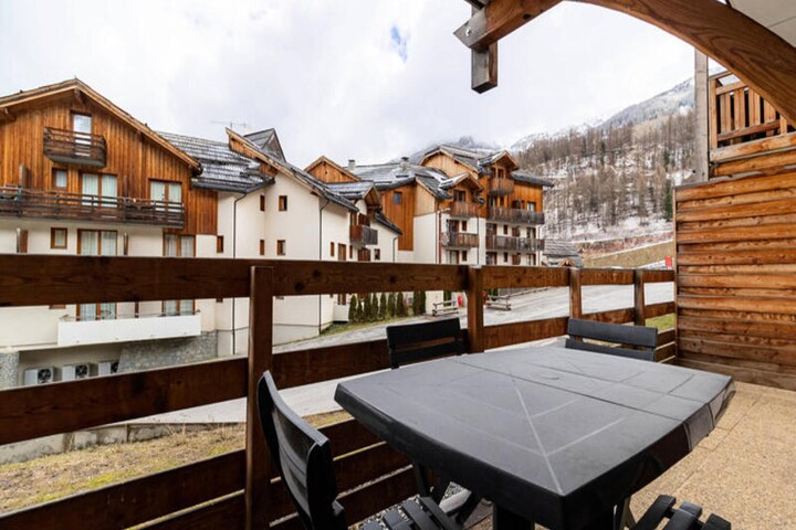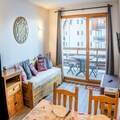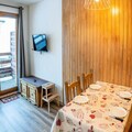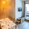 This 33m² apartment, facing North-East, provides a peaceful stay with modern amenities. It includes an entrance with storage, a cozy living room with a sofa bed and television, a dining area, and a fully equipped kitchen with a fondue set. The separate bedroom also has a television and a comfortable 140x190cm double bed. A bathroom with a bathtub and a balcony overlooking the resort, valley, and mountains complete the space, accommodating up to 4 people.