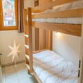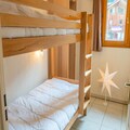 The apartment has a double bedroom and a bedroom with bunk beds, both with ample storage. A bathroom with a bathtub, heated towel rail, and hairdryer completes the space.