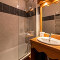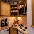 The apartment’s kitchen area is fully equipped, ensuring a comfortable self-catering experience. Guests can prepare meals with ease, thanks to the comprehensive kitchen amenities. The apartment also offers a bathroom with a bathtub for added relaxation after a day on the slopes. Additional services include heating and access to the residence’s shared facilities, such as the heated outdoor swimming pool and sauna cabins, which are open seasonally. These amenities provide the perfect space for relaxation, whether in the winter or summer months, enhancing the overall stay for guests looking for both comfort and convenience.