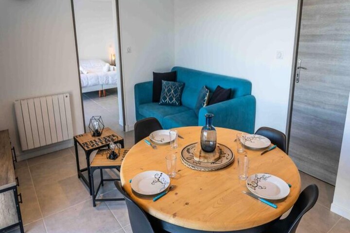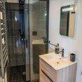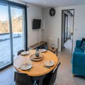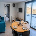 The property, along with its modern and well-appointed design, offers a 51 m² ground-floor apartment with a capacity for 6 guests. The living room features a sofa bed and a panoramic view of the Serre-Ponçon valley. The master suite, with direct outdoor access, includes a double bed and an additional sofa bed, while the cabin bedroom is furnished with two single bunk beds. The apartment also has two bathrooms with WCs. For added convenience, a free shuttle service operates every 10 minutes, providing quick access to resort activities, dining, and shops. Household linens are provided, and beds are made upon arrival, ensuring a hassle-free stay. The property is ideal for families or small groups, with the option to rent the entire chalet, accommodating up to 22 people.