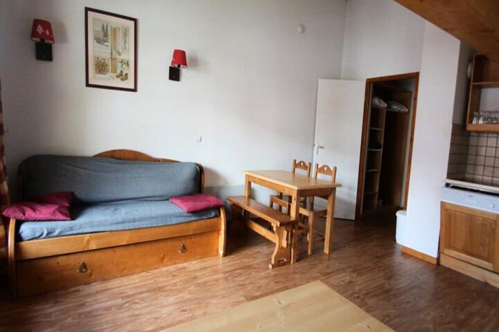 High above the picturesque valley of Puy Saint Vincent, this charming apartment in the Residence Dame Blanche offers a blend of alpine serenity and modern convenience. Imagine waking up to the crisp mountain air, stepping onto your private balcony to take in breathtaking views, and planning a day filled with adventure on the slopes or relaxation by the heated outdoor pool. Whether you're here for winter sports or summer hikes, this residence is your gateway to the stunning Hautes-Alpes region. \n\nInside, the apartment is thoughtfully designed for comfort and practicality. The cozy living room features a pull-out sofa bed, a flat-screen TV, and a dining area that invites you to share meals after a day of exploration. The fully equipped kitchen includes a microwave, dishwasher, ceramic hob, and other essentials for preparing your favorite dishes. The bedroom, with its double bed and ample storage, ensures restful nights, while the bathroom with a bathtub and separate toilet adds to the convenience. \n\nThe residence itself is a hub of activity and relaxation. Direct access to ski slopes makes it a dream for winter enthusiasts, while the heated outdoor pool and sauna provide perfect summer escapes. On-site amenities include a restaurant, snack bar, bakery, and a small grocery store, ensuring you have everything you need at your fingertips. Ski equipment rental and a coin-operated laundromat add to the ease of your stay. \n\nWhether you're seeking thrilling alpine adventures or peaceful mountain retreats, this apartment offers the perfect balance of comfort, convenience, and natural beauty. Let the charm of Puy Saint Vincent and the Residence Dame Blanche create unforgettable memories for your next holiday.