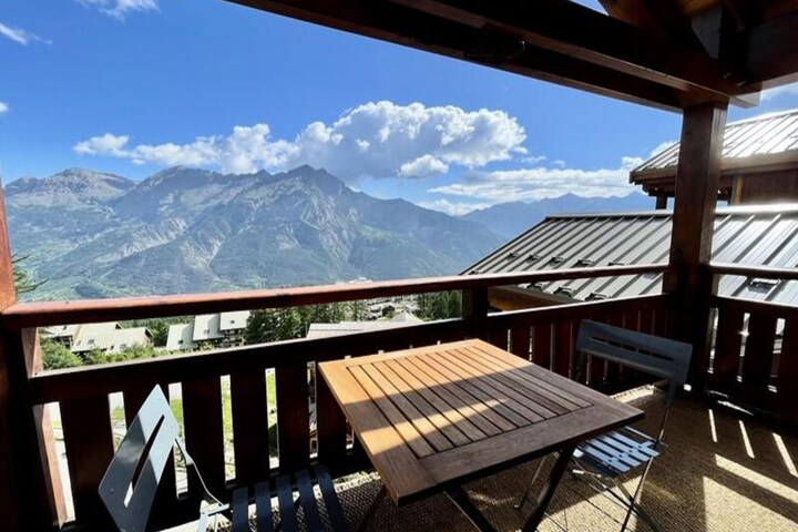 High above the picturesque slopes of Puy Saint Vincent 1800, this charming apartment offers a cozy retreat for mountain lovers seeking both adventure and relaxation. Imagine waking up to the crisp alpine air, stepping onto your private balcony with a warm coffee in hand, and gazing out at the breathtaking scenery that surrounds you. Whether you're here to carve through pristine snow or explore lush summer trails, this residence is the perfect base for your alpine escape. \n\nDesigned to accommodate 4-6 guests, the apartment features a thoughtfully equipped kitchen with modern appliances, including a raclette grill for enjoying traditional mountain meals. The living room invites you to unwind with a pull-out sofa bed, flat-screen TV, and dining area, while the sleeping arrangements include a double bedroom and a cozy cabin room with two single beds. A separate bathroom and WC ensure convenience for all, and the balcony provides a peaceful space to soak in the mountain views. \n\nThe La Dame Blanche residence boasts direct access to the ski slopes, making it ideal for winter sports enthusiasts. On-site amenities include a heated outdoor pool open during summer, a sauna for ultimate relaxation, and a ski rental shop for your convenience. A bakery, restaurant, and snack bar are just steps away, offering everything from fresh pastries to hearty meals. \n\nWhether you're visiting for the exhilarating ski season or the vibrant summer months, this apartment combines comfort, convenience, and stunning surroundings to create unforgettable memories in the heart of the French Alps.
