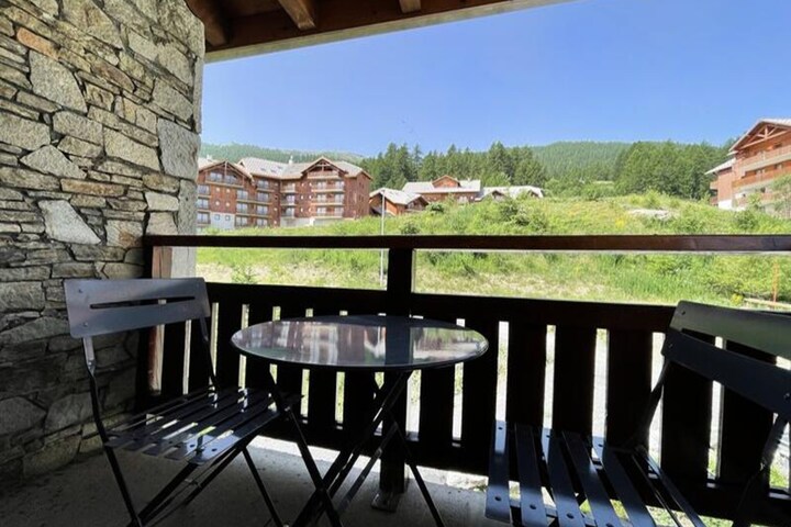 High above the picturesque slopes of Puy Saint Vincent 1800, the charming Residence Dame Blanche*** offers a cozy alpine retreat with direct access to the ski slopes. Imagine waking up to the crisp mountain air, stepping onto your private balcony to take in the breathtaking views, and heading straight out for a day of adventure on the pristine pistes. Whether you're here for winter sports or summer hikes, this residence is perfectly positioned to immerse you in the beauty of the Hautes-Alpes region. \n\nInside, the apartment is thoughtfully designed to provide comfort and convenience for up to six guests. The fully equipped kitchen features modern appliances including a microwave, dishwasher, and raclette grill, making it easy to prepare hearty meals after a day outdoors. The living room invites relaxation with its pull-out sofa bed, flat-screen TV, and dining area, while the balcony offers a serene spot to unwind. Sleeping arrangements include a double bedroom, a cozy cabin room with twin beds, and additional sofa beds, ensuring restful nights for all. \n\nGuests will love the heated outdoor pool, open during the summer months, and the sauna available for private bookings. On-site amenities include a restaurant, snack bar, bakery, and ski rental shop, making it easy to access everything you need without leaving the residence. For added convenience, free WiFi and a coin-operated laundromat are available. \n\nWhether you're seeking thrilling ski runs, tranquil hiking trails, or simply a peaceful escape surrounded by alpine beauty, Residence Dame Blanche*** is your gateway to unforgettable moments in the mountains. Book your stay today and experience the magic of Puy Saint Vincent 1800.