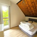 This spacious 54 m² apartment is perfect for families or groups of 6 to 7 guests. It features three bedrooms, including two double rooms (140x200) with balcony access, and a bedroom with a bunk bed (2 single beds 90x190). The apartment is pet-friendly, allowing guests to bring their furry companions for an additional fee. The living area is bright and airy, with ample storage space and access to two balconies offering panoramic mountain views. A ski locker and reserved parking for the residence add convenience for guests.
