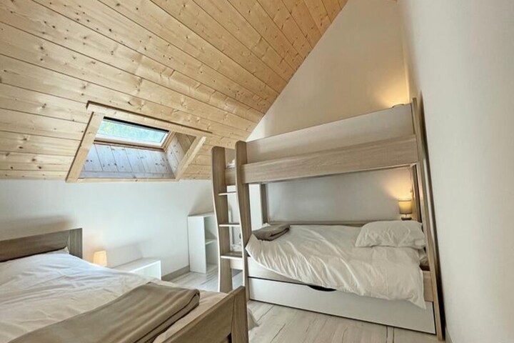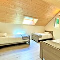 On 3 levels the Chalet is composed of: a large entrance with 2 cupboards and separate WC, 2 bedrooms with 160 double bed, bathroom with shower and WC, 2 bedrooms with 6 90 single beds, bathroom with bathtub and WC, a kitchen equipped with fridge/freezer, induction hob, oven, dishwasher, microwave, toaster, kettle, filter coffee maker,... Spacious dining room, the living room is equipped of a television. Access to the outside through the living room. Parking at the foot of the Chalet or in the garage.