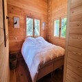 A master suite (160 cm bed) with walk-in shower and French window overlooking the forest.