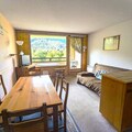Inside, you’ll find a thoughtfully designed space that comfortably accommodates up to four guests. The bedroom features a cozy double bed, while a sleeping alcove with bunk beds adds a playful touch for children or additional guests. The open-plan kitchen is fully equipped with modern appliances, making it easy to prepare meals to enjoy in the dining area with its large table and six chairs. After a day of exploring, relax in the inviting living room or step out onto the spacious balcony to soak in the crisp mountain air and stunning views.
