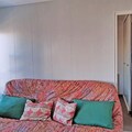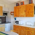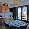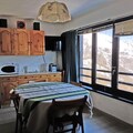Inside, the apartment is thoughtfully designed to accommodate up to five guests. The entrance features a sleeping alcove with a sturdy bunk bed, while the main room combines a kitchenette, dining area, and living space complete with a sofa bed, flat-screen TV, and mini stereo system. A separate alcove with a double bed and wardrobe ensures privacy and comfort. The bathroom is equipped with a hairdryer, and the WC is conveniently separate. Ski lockers on the ground floor and paid Wi-Fi access make your stay even more practical.