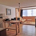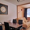 Inside, the apartment is thoughtfully designed for comfort and convenience. The open-plan living area features a fully equipped kitchen with modern appliances, including an oven, large refrigerator, dishwasher, and microwave, ensuring you can prepare hearty meals after a day on the slopes. Relax in the lounge area with a sofa bed, armchair, and flat-screen TV, or retreat to the bedroom, which boasts two double beds and ample wardrobe space. The sleek bathroom includes a walk-in shower, and free condominium WiFi keeps you connected throughout your stay.