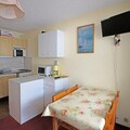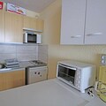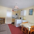 The apartment is thoughtfully designed to maximize comfort and functionality. The entrance features an alcove with a bunk bed (2 x 90cm), perfect for children or additional guests. The main living area includes a sofa bed, a dining space, and a well-equipped kitchenette with a grill oven, microwave, and all essentials for preparing meals. A bathroom with a washing machine adds convenience, while free condominium WiFi ensures you stay connected throughout your stay.