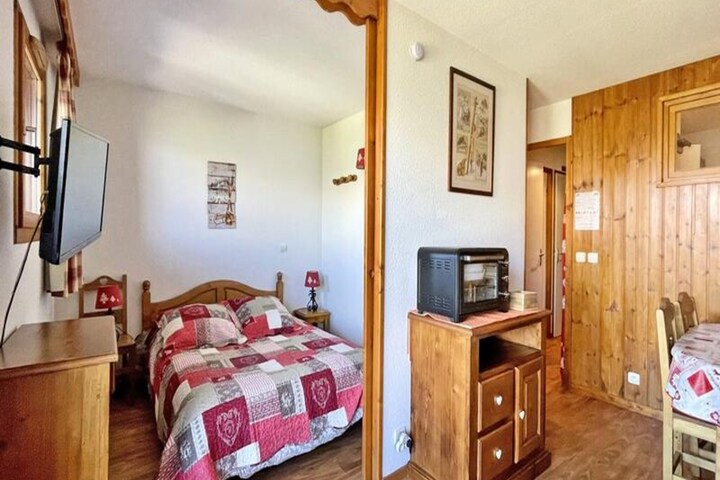 High above the charming village of Puy Saint Vincent 1800, the Residence Dame Blanche invites you to experience the perfect alpine getaway. With direct access to the ski slopes, this property offers a seamless blend of convenience and comfort, making it ideal for both winter sports enthusiasts and summer adventurers. Imagine waking up to the crisp mountain air and stepping onto your private balcony to take in breathtaking views of the surrounding peaks. Whether you're here to carve through fresh powder or explore scenic hiking trails, this residence places you at the heart of the action. \n\nInside, the apartment is thoughtfully designed to accommodate up to six guests. The cozy living room features a pull-out sofa bed, a dining area, and a flat-screen TV, creating a welcoming space for relaxation after a day outdoors. The well-equipped kitchen includes modern amenities such as a microwave, dishwasher, and coffee maker, ensuring you have everything needed to prepare delicious meals. Two separate sleeping areas—a bedroom with a double bed and a cabin room with twin beds—provide comfort and privacy for families or groups. Additional conveniences include a separate bathroom and WC, as well as free WiFi throughout the property.\n\nThe residence boasts a heated outdoor pool open during the summer months, perfect for unwinding under the alpine sun. A sauna is available by reservation for those seeking extra relaxation, while practical amenities like a coin-operated laundromat and ski equipment rental shop ensure a hassle-free stay. At the foot of the residence, you'll find a restaurant, snack bar, and bakery offering local delights, along with a grocery store for essentials.\n\nWhether you're drawn to the thrill of skiing, the tranquility of mountain landscapes, or the charm of Puy Saint Vincent, Residence Dame Blanche offers an unforgettable escape. Let the beauty of the French Alps inspire your next adventure.