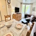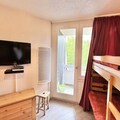 The apartment features a spacious living room with a south-west facing balcony, allowing plenty of natural light. The fully equipped kitchen includes a combination oven, dishwasher, microwave, Nespresso coffee machine, and toaster for all your cooking needs. The living room also has a sofa bed, and the separate bedroom is furnished with two single bunk beds and a double bed, as well as access to the balcony and a TV. A bathroom and separate toilet complete the layout.