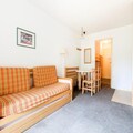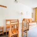 Property, along with its practical and compact layout, comfortably accommodates up to 5 people. The living room features 2 single sofa beds, one of which includes a pull-out bed suitable for children, and there is a cabin area with a bunk bed. The apartment also includes a dining area with a table, chairs, and a bench. A furnished balcony adds to the charm, providing a relaxing outdoor space with tree-lined views. The residence is pet-friendly (subject to conditions) and provides ski lockers for guests. Additional services such as Wi-Fi, bed and bathroom linen, and cleaning are available for an extra charge. End-of-stay cleaning is mandatory.