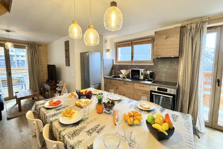 In the vibrant heart of Vars Les Claux, this newly completed residence offers the perfect alpine retreat for families and groups seeking a blend of comfort and adventure. Just 200 meters from the snow front and steps away from local shops, this spacious apartment is your gateway to the breathtaking Forêt Blanche ski area. Whether you’re here to carve through fresh powder or enjoy the serene mountain atmosphere, this property provides an ideal base for your holiday. \n\nThe apartment accommodates up to 10 guests across its thoughtfully designed layout. On the ground floor, a cozy double bedroom with an en-suite shower room ensures privacy, while a separate toilet adds convenience. Upstairs, you’ll find a second shower room, a bedroom with a bunk bed and terrace access, and another room with three single beds that can be converted into a double. The living area features two sofa beds, a large dining space, and a fully equipped kitchen with modern appliances, including a Nespresso machine and dishwasher. The highlight? A convertible dining table that transforms into a pool table, perfect for entertaining after a day on the slopes. \n\nStep outside onto the expansive terrace or balcony to soak in panoramic views of the surrounding peaks. A private parking space adds to the convenience, making it easy to explore the resort and beyond. While the residence is complete, ongoing construction in the neighboring complex may occasionally be noticeable. \n\nWith its prime location, modern amenities, and stunning vistas, this apartment is an exceptional choice for those looking to experience the magic of the mountains. Whether it’s skiing, hiking, or simply unwinding in a tranquil setting, your alpine escape awaits.