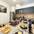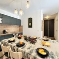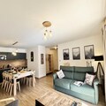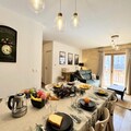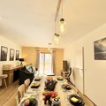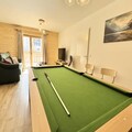 The spacious two-bedroom apartment comfortably accommodates up to eight guests, making it perfect for families or groups of friends. The first bedroom features a cozy double bed and a double sofa bed, while the second bedroom offers two single beds that can be converted into a double, complete with its own en-suite bathroom and toilet. For additional flexibility, the living room includes another sofa bed. The apartment boasts a second bathroom, a large dining table that transforms into a pool table, and a fully equipped kitchen with modern appliances such as a Nespresso machine, dishwasher, and oven. The living area opens onto a private terrace, inviting you to relax and soak in the alpine ambiance. A baby crib is also available for families traveling with little ones.
