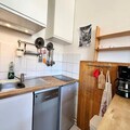 Inside, the apartment is thoughtfully designed to maximize comfort and functionality. The well-equipped kitchen includes a filter coffee machine, toaster, dishwasher, refrigerator, ceramic hob, and even a raclette and stone grill for those cozy alpine evenings. The living area features a sofa bed (140 cm), while the sleeping nook offers two single bunk beds, perfect for children. A modern bathroom with a toilet and a television in the living room add to the convenience, ensuring a relaxing experience after a day of adventure.