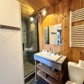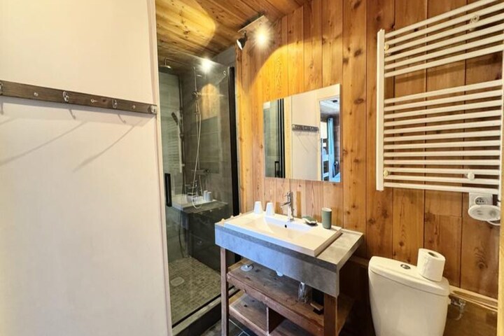 Spanning 80 m², the apartment combines modern comfort with warm alpine charm. The light-filled living area, with its expansive windows, creates a welcoming space to relax and reconnect. The fully equipped kitchen is a haven for culinary enthusiasts, featuring everything from a raclette grill and fondue set to a Dolce Gusto and Senseo coffee machine. With a dishwasher, oven, induction hob, and even a washing machine and dryer, every detail has been considered for your convenience. The sleeping arrangements are thoughtfully designed: a double bedroom with a glass partition, a family room with six single bunk beds and a desk, and a third bedroom with a double bed, two single bunks, and an en-suite shower room. A modern bathroom with a hairdryer and straightener completes the amenities.