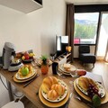 The apartment features a functional and inviting layout, with a living room that includes a comfortable sofa bed (160x190 cm) and a small dining area for shared meals. The kitchen is thoughtfully equipped with a refrigerator, combination oven, raclette grill, and a Senseo coffee machine, making it easy to prepare hearty breakfasts or après-ski dinners. A sleeping alcove with three single beds provides a cozy space for restful nights, while the modern shower room and separate toilet add convenience to your stay.