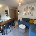 For those seeking further exploration, a free shuttle stop nearby allows easy access to the resort in just 15-20 minutes, ensuring both relaxation and adventure. This spacious apartment features a cozy cabin with three single bunk beds and a double bedroom with a TV. A stylish living room with a sofa, dining table for six, and an open kitchen equipped with modern amenities, including a traditional oven, induction hob, dishwasher, and Nespresso coffee machine, makes it a perfect space to unwind.
