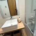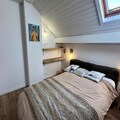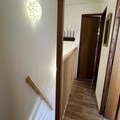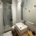 The apartment features two double bedrooms and a third double cabin bedroom, ideal for family or group stays. There are two bathrooms: one with a bathtub and toilet on the ground floor, and the second with a shower and toilet on the upper level.