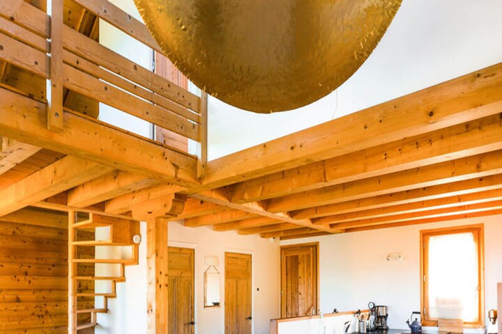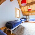 Upstairs, you’ll find a mezzanine with a TV corner and a dormitory featuring four single beds and a trundle bed, perfect for families. A shower room serves this level. On the lower floor, there are two double bedrooms and a room with two single bunk beds, along with a bathroom equipped with double sinks for added convenience.