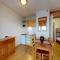 This cozy 3-star apartment, located in the La Grive residence at Chamrousse resort, France, is perfect for up to four guests. The 26m² ground-floor apartment features a living room with a terrace and TV, along with an open kitchen equipped with a fridge, freezer, dishwasher, microwave, coffee maker, kettle, and toaster. Sleeping arrangements include a double sofa bed in the living room and two bunk beds in the entrance hall. The apartment also has a bathroom with a bathtub and a separate toilet.