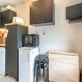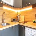 The open-plan electric kitchen comes fully equipped with a refrigerator, microwave, dishwasher, coffee machine, toaster, kettle, and all the necessary utensils and dishware. Whether you're preparing a hearty breakfast before hitting the slopes or a cozy dinner after a day outdoors, this studio combines practicality with charm for a truly memorable alpine retreat.