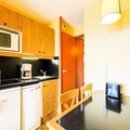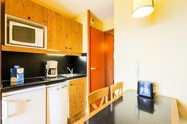 The apartment features an open kitchen area with a dining table for two and a bathroom with a bathtub and WC. For added convenience, the rental includes a covered parking space (at an additional cost), and guests can enjoy access to an outdoor heated swimming pool nearby. Housekeeping services and end-of-stay cleaning are available at an extra charge, ensuring a comfortable and effortless stay.