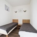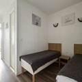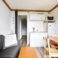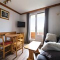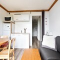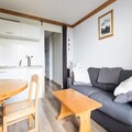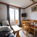 This cozy apartment in Alpe d'Huez offers a comfortable stay for families or small groups. It includes a living room with a sofa bed, a cabin area with 2 single beds, and a dining table with 4 chairs. The apartment is pet-friendly, allowing pets with prior authorization and an additional charge. Other amenities include a television, balcony with mountain views, and parking. A private parking space is provided, with additional public parking options nearby. Bed linen and towels are available for an extra charge, and a mandatory end-of-stay cleaning service applies.