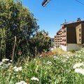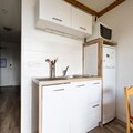 The apartment includes a fully equipped kitchen, open to the living room, perfect for preparing meals. The bathroom features a bathtub, and there is a separate toilet for convenience. A balcony with outdoor seating allows guests to enjoy meals or relax with mountain views. Additional amenities include a ski locker, sauna (for a fee), and free access to the outdoor pool from 4 p.m. to 7:30 p.m.