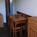 The apartment includes a compact kitchen open to the living area, equipped for preparing meals. The bathroom features a bathtub and WC, providing all the essentials for comfort. A dining area with a table and chairs adds convenience, while the balcony is outfitted with furniture for relaxing outdoors. Paid public parking is just 50 meters away, and Wi-Fi access is available at an additional charge.