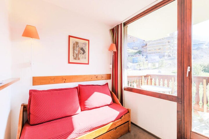 This charming chalet offers a cozy retreat in the heart of the Alps, accommodating up to six guests. The living room features a sofa bed and trundle bed for two, while the cabin area provides two single bunk beds. A separate bedroom includes a comfortable double bed, ensuring restful nights. The chalet welcomes pets for an additional fee and provides a balcony equipped with a table and chairs, ideal for enjoying scenic views. Amenities include a television, optional Wi-Fi, a safe, and a dishwasher, creating a convenient and inviting space.
