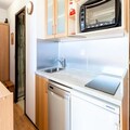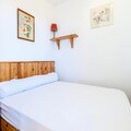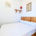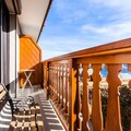 The apartment includes an open kitchen with a dining area featuring a table, chairs, and stools. The bathroom is equipped with a bathtub, complemented by a separate toilet for added convenience. Additional amenities include a television, hairdryer, iron, ski locker, and electric shutters for the balcony. Optional services like bed linens, Wi-Fi, and end-of-stay cleaning are available at an extra charge, ensuring a comfortable and hassle-free experience.