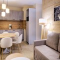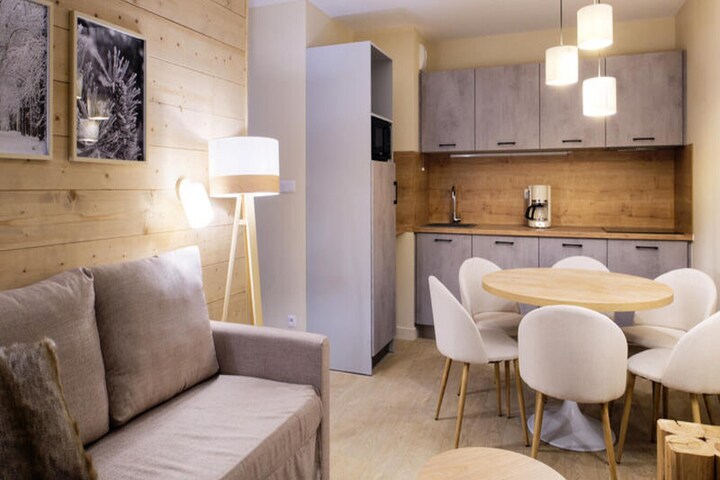 The apartment includes a well-equipped kitchenette for convenient meal preparation and a separate bathroom with a shower and toilet. The building also boasts a wellness area featuring a heated indoor pool, a paddling pool, a sauna, and hammam facilities. Additional amenities such as a baby kit, breakfast service, and massage cabins are available to enhance your holiday experience.