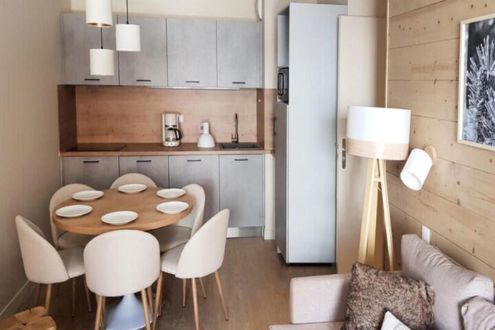 Designed for convenience, the apartment includes a fully equipped kitchenette, a bathroom, a shower room, and a separate toilet. Guests can enjoy access to a heated indoor swimming pool, paddling pool, sauna, hammam, and fitness center. Optional breakfast service and massage treatments add extra comfort, ensuring a rejuvenating stay. The property combines modern amenities with a serene mountain retreat.