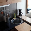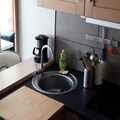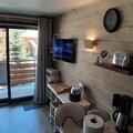 The studio boasts a well-equipped kitchen with a combined microwave, two ceramic hobs, an extractor hood, a refrigerator, and a dishwasher, making meal preparation simple and efficient. The bathroom includes a shower and toilet, ensuring comfort during your stay. Relax on the south-facing balcony after an active day, or store your gear in the ski locker for added convenience. Heating keeps the space warm and inviting year-round.