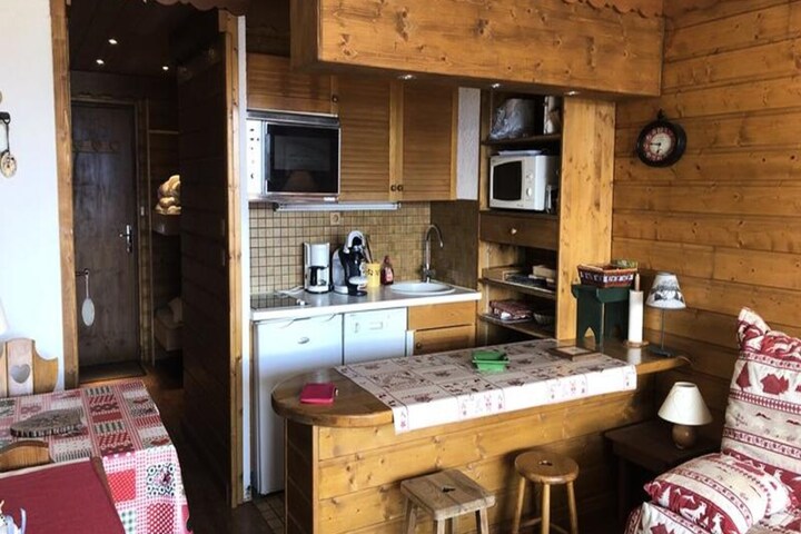 This cozy studio with a habitable hall offers a comfortable and practical stay in the heart of the mountains. The habitable hall includes two bunk beds (2x80), and the living room features a sofa bed and a TV for relaxation after a day of activities. Ideal for couples, small families, or friends, this property is a pet-free environment, ensuring a peaceful and allergy-friendly stay. Guests also benefit from outdoor parking and a ski locker for secure storage of gear.