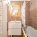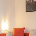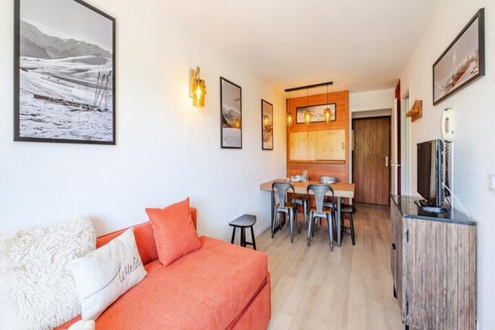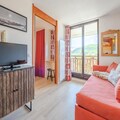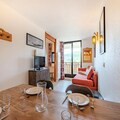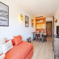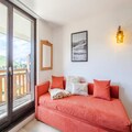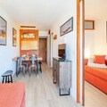 This cozy 32m² apartment on the fifth floor offers a delightful retreat with unobstructed views of the mountains, golf course, and tennis courts. It features a bedroom with chaise longue-style trundle beds for two, a cabin area with two bunk beds, and a living room with another set of chaise longue-style trundle beds, ensuring ample space for up to six guests. The apartment is pet-free, maintaining a clean and allergy-friendly environment. Please note that bed linen, towels, and end-of-stay cleaning services are not included, allowing guests to personalize their experience.
