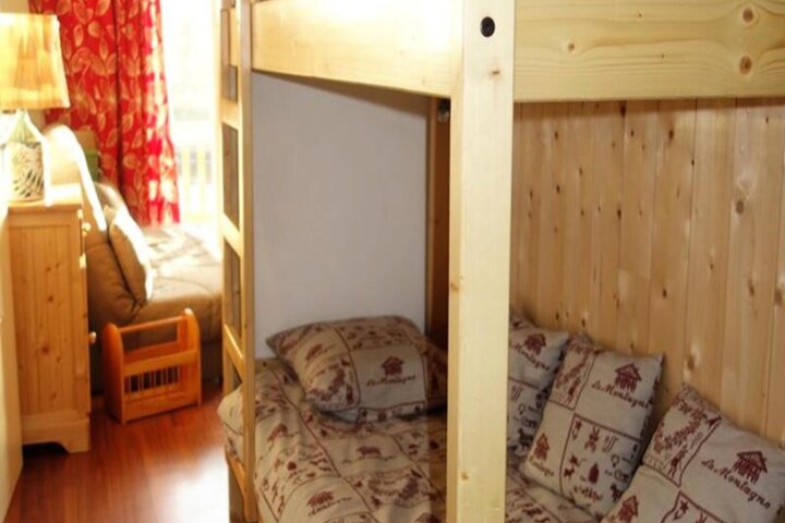 This 32m² studio apartment, located on the second floor, is perfect for up to 6 guests. The habitable hall features two bunk beds, while the living room offers a comfortable double folding bed, TV, and DVD player for entertainment. The property is not pet-friendly, ensuring a quiet and peaceful environment. A south-facing balcony provides great views, and a ski locker (No. 31) is available for storing your ski gear after a day on the slopes.
