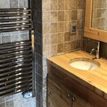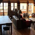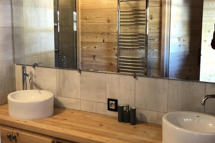 The chalet features a fully equipped American kitchen with an induction hob, oven, microwave, fridge-freezer, dishwasher, toaster, coffee maker, washing machine, and dryer. The bathrooms include separate showers, a bathtub, and WC. The spacious living room has two sofas, a TV, a fireplace, and free Wi-Fi. A large south-facing terrace offers stunning views, and a garage is available. Bed linen, towels, and end-of-stay cleaning are not provided, but heating ensures comfort throughout your stay.