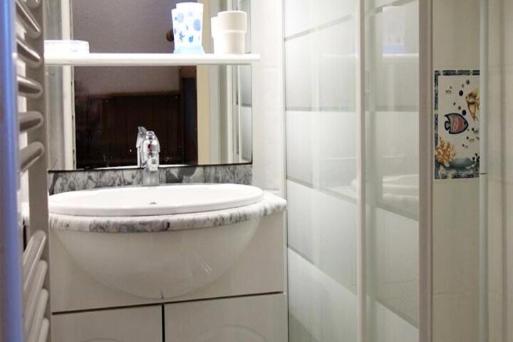 The well-equipped kitchen features a mini electric oven, two ceramic hobs, a refrigerator, and a washing machine, offering everything you need for a comfortable stay. The bathroom includes a shower, and there is a separate WC for convenience. A south-facing balcony provides stunning views, and the ski locker ensures that your equipment is securely stored. Bed linens, towels, and end-of-stay cleaning are not included in the rental. Heating is also provided for a warm and comfortable stay.