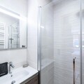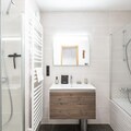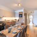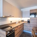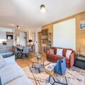 Spanning an impressive 118m², this beautifully designed apartment comfortably accommodates up to 8 adults and 2 children. The inviting living room, complete with a cozy lounge area, video projector, and double sofa, is perfect for relaxing evenings. The open-plan kitchen, fully equipped for all your culinary needs, flows seamlessly into the dining area, which seats eight. Step out onto the southwest-facing terrace to soak in the crisp mountain air and stunning views. The apartment features four well-appointed bedrooms, including two en suite double rooms and a family room with a double bed and two single Murphy beds. Additional amenities include a separate bathroom with both a bathtub and shower, two separate toilets, and a laundry room with a washing machine, dryer, and iron.