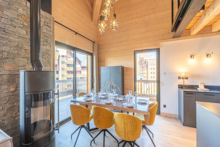 In the serene Bergers district of Alpe d'Huez, this luxurious apartment in the new Chalets du Golf residence invites you to experience the perfect blend of alpine charm and modern sophistication. With its breathtaking mountain views and prime location just 150 meters from the nearest ski lift, this property offers unparalleled ski-in/ski-out convenience, making it an ideal retreat for winter sports enthusiasts and nature lovers alike. Imagine starting your day with the crisp mountain air and ending it with the glow of the setting sun over the peaks, all from the comfort of your private 20m² terrace. \n\nThe apartment spans two floors, thoughtfully designed to accommodate up to eight guests in absolute comfort. The ground floor features a bright and inviting living area, an open-plan fully equipped kitchen, and a double en-suite bedroom. Upstairs, you’ll find three additional double bedrooms, including another en-suite, and a private bathroom. Every detail has been carefully curated to ensure a seamless stay, from the elegant decor to the high-end amenities. \n\nGuests will appreciate the included services such as linens, beds made upon arrival, bathroom essentials, and end-of-stay cleaning. The property also offers both indoor and outdoor parking spaces for added convenience. Beyond the residence, the vibrant Alpe d'Huez offers a wealth of activities year-round, from world-class skiing and snowboarding in winter to hiking and cycling trails in summer. With its prime location and luxurious touches, this apartment is the perfect base for creating unforgettable alpine memories.