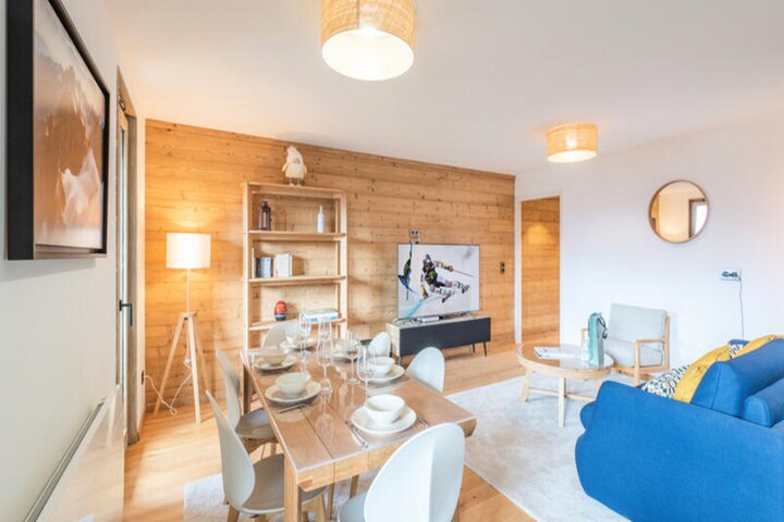 At the heart of Alpe d'Huez, in the charming Vieil Alpe district, lies the Quartz residence—a perfect retreat for mountain enthusiasts seeking both adventure and relaxation. This newly built residence harmoniously blends modern comfort with alpine charm, offering a cozy atmosphere that invites you to unwind after a day on the slopes. With its prime location, you can ski directly back to the residence and enjoy seamless access to the nearby ski lifts, making it an ideal choice for winter sports lovers. The south-facing apartment bathes in natural light, creating a warm and inviting space for up to four adults. \n\nInside, the apartment boasts a thoughtfully designed layout featuring an open kitchen connected to a comfortable living and dining area. The master bedroom includes an en-suite shower room, while the second bedroom offers two single beds, perfect for families or friends traveling together. Additional amenities include a bathroom with a bathtub, a separate toilet, ample storage, and an 8m² balcony where you can soak in the stunning mountain views. The residence also provides practical facilities such as a ski locker with boot dryer, bicycle storage, and Wi-Fi to ensure a hassle-free stay. \n\nThe Vieil Alpe district is brimming with charm and convenience, offering easy access to cable cars, the ESF ski school, and a variety of shops, restaurants, and entertainment options. Whether you’re exploring the slopes, relaxing in the sports center with its swimming pool and gym, or catching a movie at the cinema, everything you need is just steps away. \n\nChoose Quartz for your next alpine getaway and experience the perfect blend of adventure, comfort, and mountain charm. With its exceptional location and thoughtful amenities, this residence promises unforgettable memories in the heart of Alpe d'Huez.