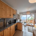 Inside, the apartment is thoughtfully designed to combine comfort and authenticity. The open-plan kitchen flows seamlessly into the cozy living and dining areas, creating a welcoming space for shared meals and relaxation. The property accommodates up to four guests, featuring a double bedroom and a children’s room with bunk beds. A south-facing balcony offers a tranquil spot to sip a warm drink while soaking in the panoramic alpine vistas. Additional amenities include a ski locker, ensuring convenience for winter sports enthusiasts.