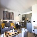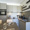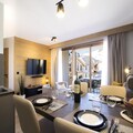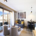 The apartment itself is a haven of modern design and thoughtful touches. The living/dining room, complete with a smart TV and sound bar, opens onto a cozy 10m² northwest-facing terrace equipped with garden furniture and electric heating—perfect for enjoying a glass of wine as the sun sets over the mountains. The kitchen is a chef’s dream, featuring a combination microwave oven, washer-dryer, dishwasher, refrigerator, induction hob, wine cellar, kettle, and coffee machine. The bedroom boasts a plush 180cm double bed and a smart TV, while a sleeping alcove with bunk beds provides a cozy space for children or additional guests. A sleek shower room and separate toilet complete the layout, ensuring convenience for all. Additional perks include a private garage and a ski locker with a boot dryer, making your stay as seamless as possible.