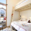 Inside, the apartment boasts a spacious living area that seamlessly blends comfort and style. The fully equipped kitchen features modern appliances, including an oven, dishwasher, washing machine, dryer, microwave, and induction hob, making it easy to prepare hearty meals after a day of adventure. The living room, with its smart TV and access to a 21 m² south-east-facing balcony, is the perfect spot to unwind. The sleeping arrangements are thoughtfully designed, with one bedroom offering two double bunk beds, another with two single beds that can be joined to form a double, and a master bedroom with a double bed and private shower room. Each bedroom is equipped with a smart TV, ensuring entertainment for all. Additional conveniences include a bathroom, two separate toilets, and a garage.